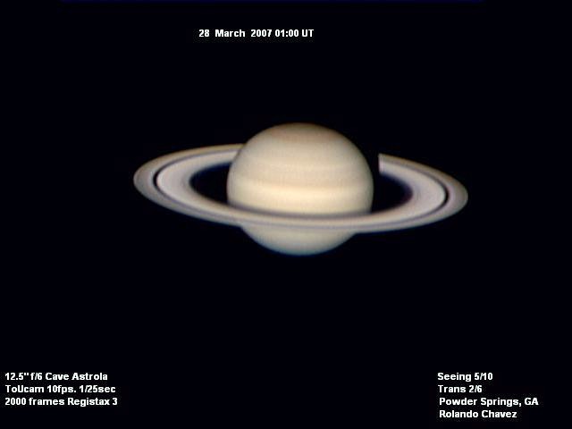 On the clearest night - given a stable, non-turbulent atmosphere, a large telescope with precision optics, and a fine eyepiece, you may actually see an image this colorful and crisp. Mr. Roland Chavez took his picture with a Cave Astrola 12.5” F/6 Newtonian reflector telescope in the same month I last viewed Saturn with my Cave Astrola 12.5” F/5 telescope in Spring 2007. This is about how it appeared at 600X on a night of virtually perfect seeing. This image benefits from eliminating the effects of wind buffeting and enhancing contrast with algorithms and other techniques like combining multiple images and discarding inconsistent image data. |