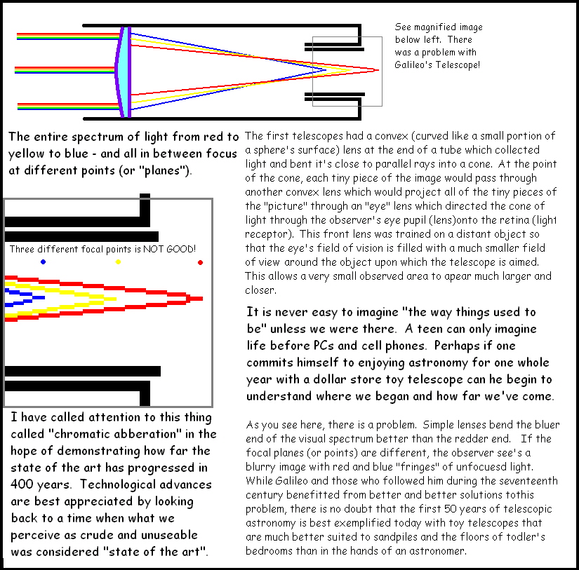 Don’t get the idea that Galileo or any other astronomer of his time ever saw anything through a telescope that rivaled cheap telescopes of today. The original telescope designs used simple lenses. As it turned out, the world had to wait quite awhile before the technology necessary to improve this invention to work well. When you take a look through a modern telescope, you will see things Galileo could not even imagine |